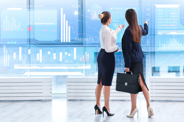 Two colleagues working on new global financial strategy analysis plan using laptop.Modern business team innovation concept.Project meeting at office with virtual graph and chart data interface