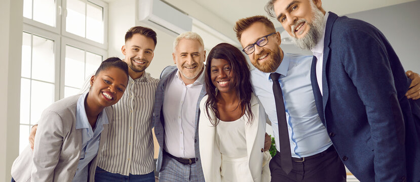 Group of business multiethnic people men and women looking at camera hugging and smiling indoors. Company employees team or group of staff standing in the office confidently and cheerfully. Banner.