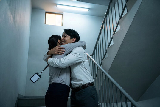Attractive caucasian woman, respectfully hugging her teammate at the office.