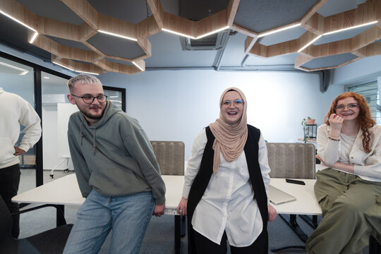A group of young business professionals stands together, taking a well-deserved break from their busy workday, showcasing camaraderie, teamwork, and a moment of relaxation in their dynamic workplace