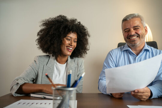 Young corporate business partners engaged in a collaborative discussion, using a laptop and documents in a modern office environment.