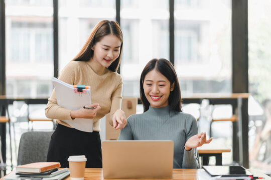 Two young women working together in a modern office, discussing documents and using a laptop, fostering a collaborative and positive work atmosphere.