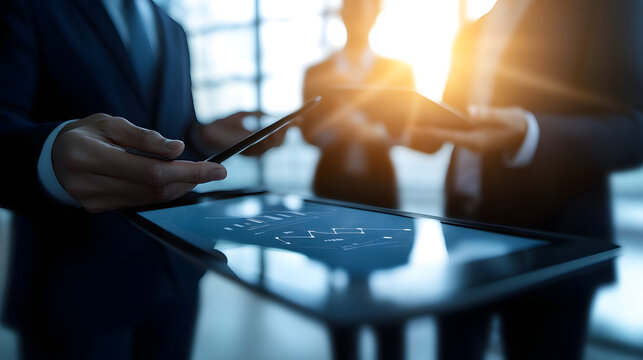 Colleagues collaborating on a business project, discussing data and ideas using a modern digital tablet in a professional office