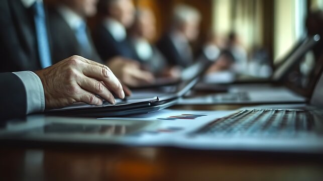 Close-up of a businessman's hands using a tablet displaying financial charts.  Blurred colleagues in the background suggest a business meeting or collaboration.