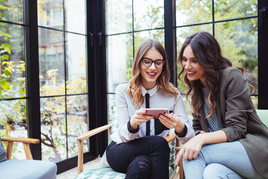 Two happy women friends smiling and watching funny photos on a social media cellphone app. A pair of girls having fun buying together on a online shop with a smart phone. Ladies using a mobile phone