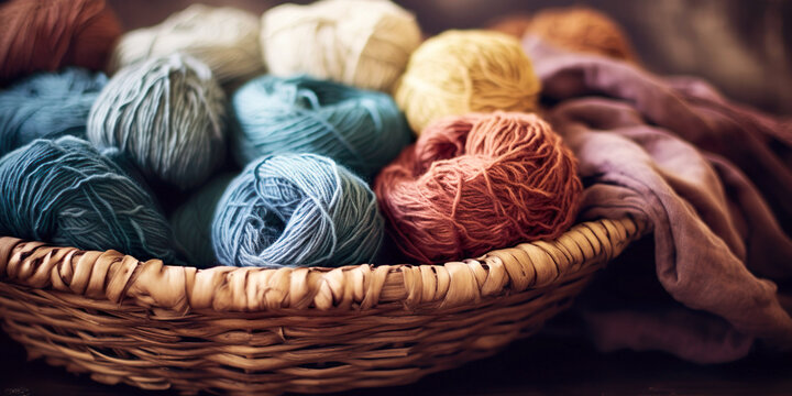 Close-up of a ball of multi-colored wool, ideal for knitting and creative textile projects. This image captures the texture and earthy feel of the woolen thread.