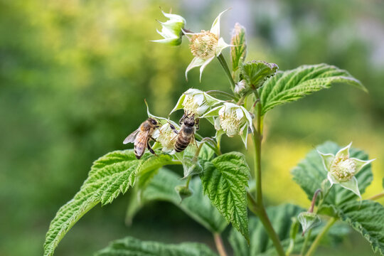 Raspberry branches with flowers and a bee collecting nectar from flowers