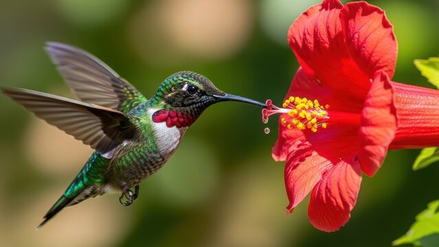Ruby-throated hummingbird collecting nectar from a vibrant red hibiscus flower.