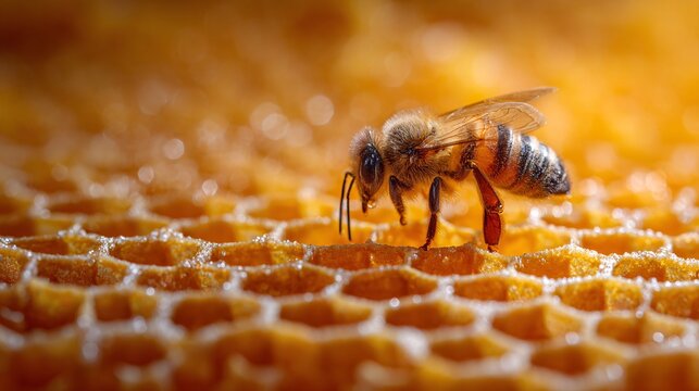 honey bees collecting nectar on honeycomb in a sunlit hive garden