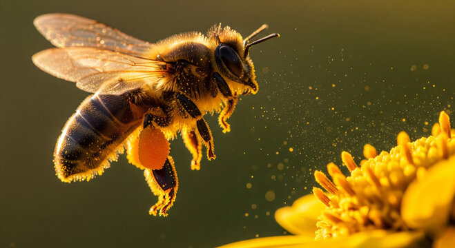 A close-up shot of a busy bee collecting nectar from a bright yellow flower