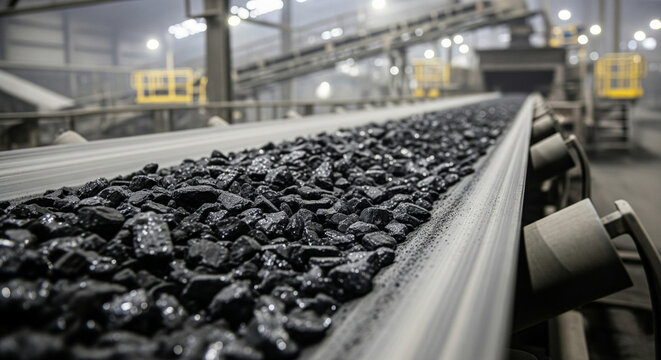 Close-up of coal on the conveyor belt of a beneficiation factory, the process of transporting minerals, coal mining industry