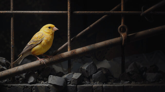 a lone yellow canary in a vintage iron cage, symbolizing a warning in a dark, atmospheric coal mine tunnel.