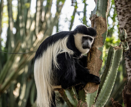 Black-and-white colobuses colobus monkey curious and observing while sitting on a tree