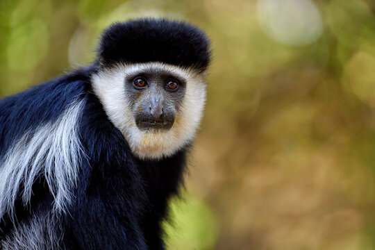 Portrait of Mantled guereza, black-and-white colobus monkey, Colobus guereza, beautiful african primate isolated on green background, looking at camera. Wild animal scene, Bale mountains, Ethiopia.
