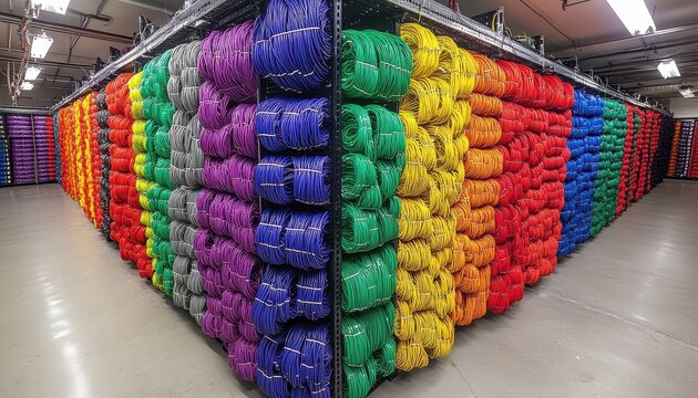 High-tech server room with colorful cable connections