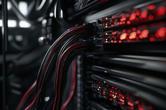A close-up of the glowing LED lights on a server rack, the intricate connections of fiber optic cables visible behind the mesh front, creating a sense of organized complexity