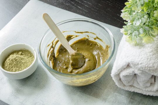 Henna dry powder, glass bowl with henna rehydrated, white terry towel on a marble mat. Home hair coloring by  organic eco-friendly paint.