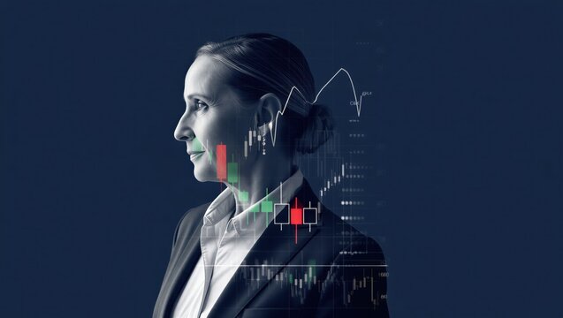 Businesswoman in a suit with a thoughtful expression, overlaid with financial charts and graphs. Professional finance and investment concept.