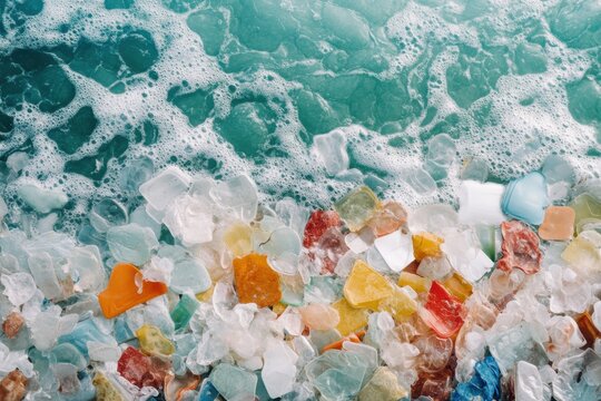 Floating microplastic fragments in murky green fluid affects aquatic environment