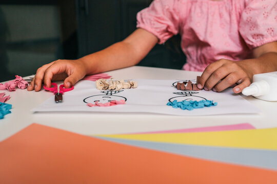 Child creating a paper art project using drawings, colored paper, glue, and scissors. Hands-on educational activity with bright pastel sheets and creative textured hair on cartoon faces