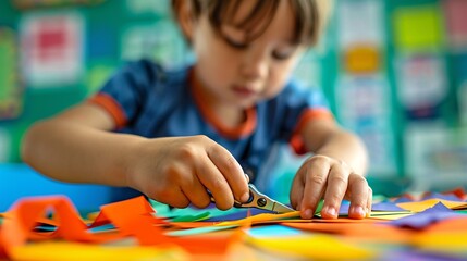 Child using safety scissors to cut colored paper during an arts and crafts session