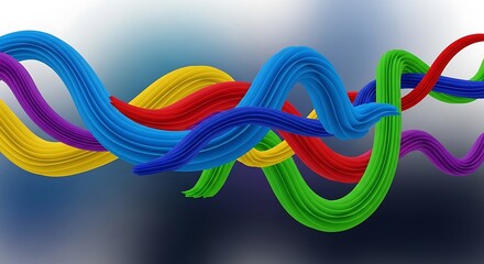 Colorful abstract spherical objects with swirling rainbow patterns and flowing ribbons on white background