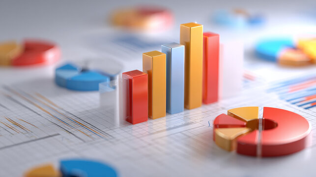 Professional 3D bar chart and pie chart on financial report. colorful visual concept representing data analysis, business growth, investment strategy, and market statistics