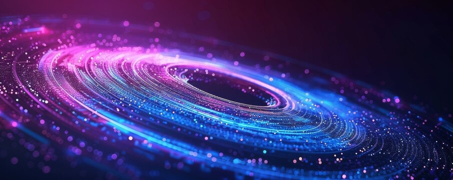 Abstract technology background with vibrant neon circular patterns and particle effects