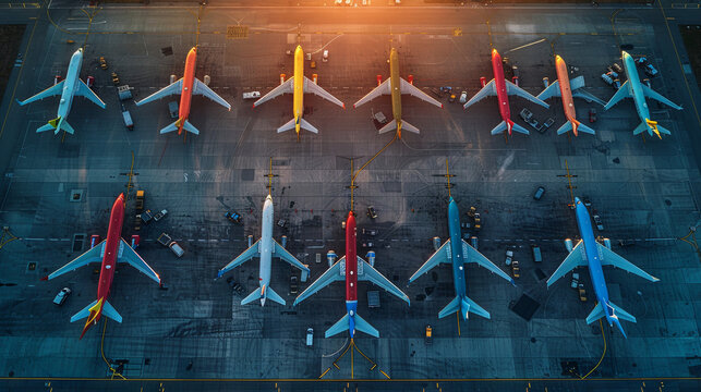 Top view of colorful airplanes parked in a row on airport apron, symbolizing international flights, commercial aviation, logistics, ground service and modern transportation