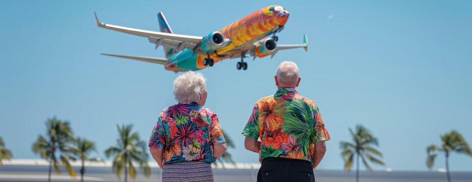 An elderly couple watching a colorful plane taking off at a tropical airport, symbolizing their love for vacation travel and adventures together in retirement