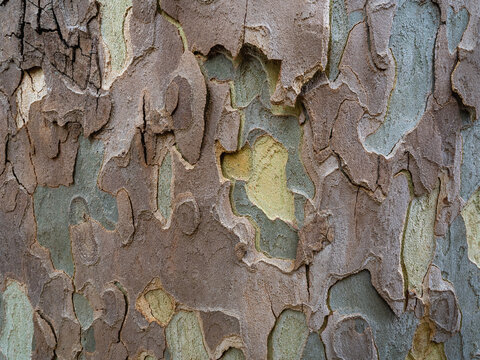 Closeup view of layered plane tree bark - beautiful textured grey,  green, brown and creamy natural background