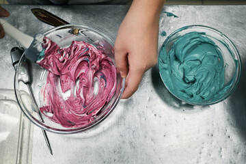 Directly above view of unrecognizable confectioner making sweet colorful toppings for cake in restaurant kitchen