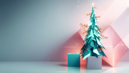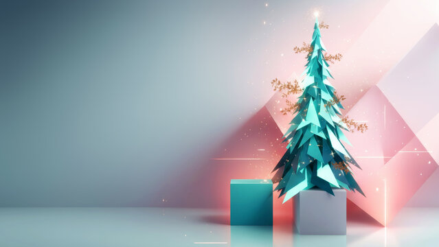 Minimalist Christmas tree display in a festive room with geometric design. Holiday product showcase for greeting card and seasonal promotion.