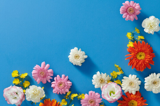 Flat lay with a floral pattern featuring wildflowers, green leaves, and branches on a blue background, providing copy space image.