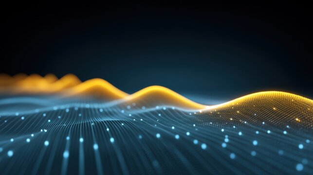 Abstract digital waves with glowing lines and dots creating a sense of movement and energy against a dark background for technological themes