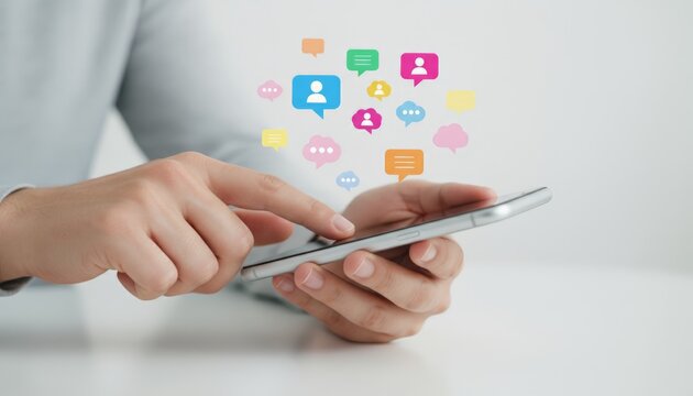 Person's hands interacting with a smartphone displaying various colorful chat bubble and user profile icons, representing online communication, networking, and digital connection
