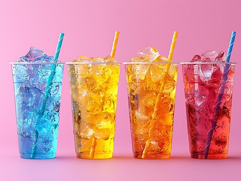 Four colorful slushy drinks in red, green, blue, and orange with straws isolated on transparent background