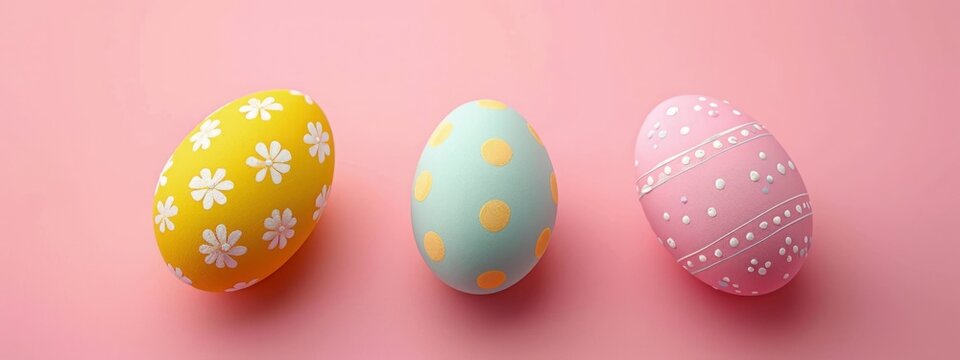 Vibrant painted easter eggs on pink background with copy space