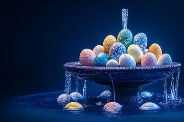 A decorative fountain centerpiece with floating Easter eggs, isolated on a dark blue background.
