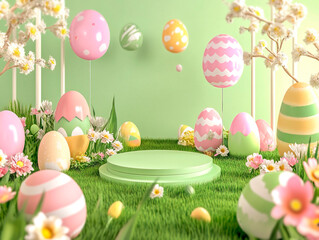 Scene of vibrant Easter celebration featuring a grassy field with scattered colorful Easter eggs, flowers, and a floating Easter banner - Generative AI