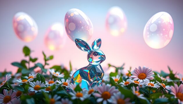 Ethereal Easter Scene with Floating Iridescent Eggs, Crystal Bunny, and Daisy Flowers on a Gradient Background