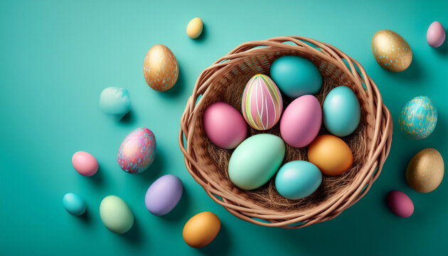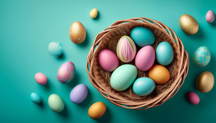 colourful easter eggs in a basket on turquoise background