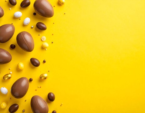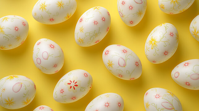 Brightly colored eggs scattered on a sunny yellow background, perfect for springtime celebrations and festive designs