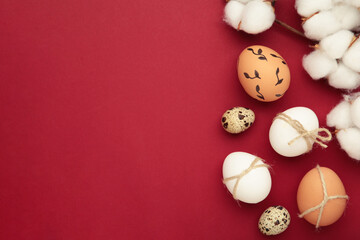 Different graphic hand-painted eggs on bright red background. Easter concept. Place for text.