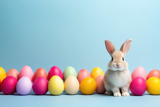 An easter bunny rabbit wearing sunnies shades sunglasses and colorful easter eggs on a blue background