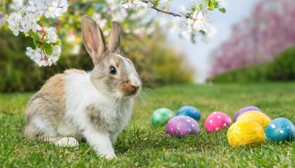 Cute bunny in spring garden with colorful easter eggs and blossoms in background