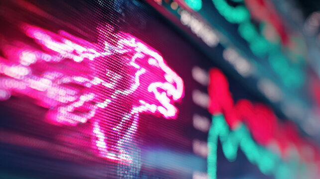 Neon pink eagle digital art with data visualization and monopoly style graph blurred background showing dynamic market trends