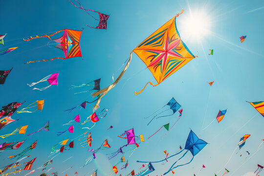 Beautiful greeting card with colorful kites soaring high above vibrant sky to holiday composition
