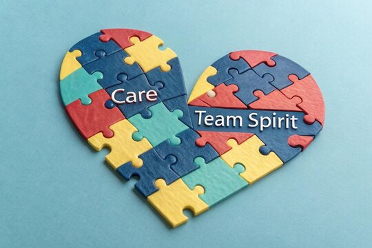 Vibrant heart-shaped jigsaw puzzle symbolizing autism awareness and unity, with colorful pieces scattered around a white background.