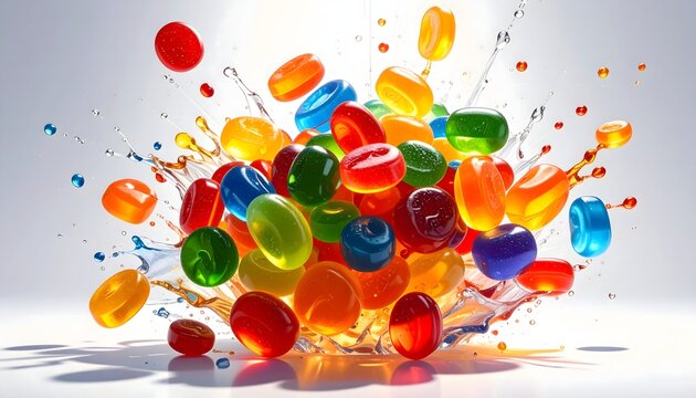A dynamic explosion of colorful hard candies splashing with vibrant liquids against a bright background. Perfect for themes of energy, celebration, sweets, and playful fun